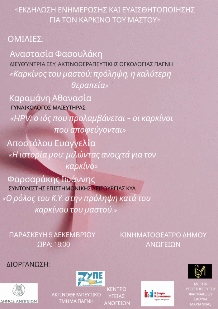 Το Κέντρο Κοινότητας Δήμου Ανωγείων ,το Τμήμα Κοινωνικής Προστασίας Παιδείας Πολιτισμού του Δήμου Ανωγείων στα πλαίσια των αρμοδιοτήτων τους διοργανώνουν σε συνεργασία με την Κινητή μονάδα Μαστογραφίας της Περιφέρειας Κρήτης, το Κέντρο Υγείας Ανωγείων και το ακτινοθεραπευτικό τμήμα του ΠΑΓΝΗ με την υποστήριξη του φαρμακείου της Μαριάννας Σκουλά μία ημέρα αφιερωμένη στην πρόληψη του καρκίνου του μαστού.