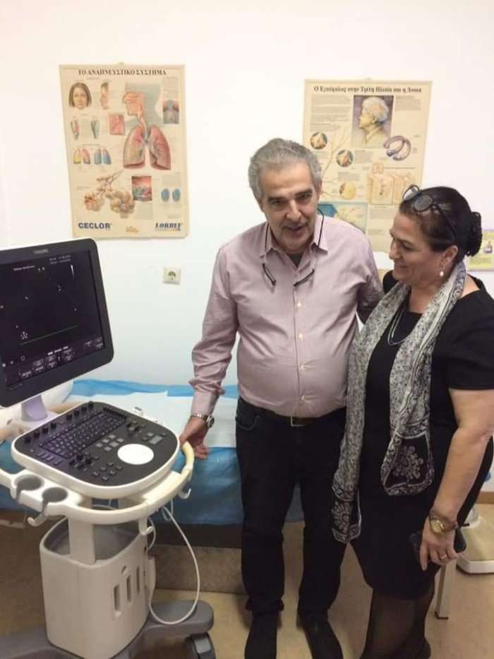“Το καινούριο μηχάνημα το οφείλουμε στον φίλο μου Αλέξη Σαρρηγεωργίου πρόεδρο και διευθύνοντα σύμβουλο της Eurolife Ασφαλιστικής. Χωρίς να τον πιέσω, χωρίς να το απαιτήσω. Γιατί οι Ανωγειανοί ούτε επαιτούν, ούτε απαιτούν! Για τον λόγο αυτό τον ευγνωμονώ όπως και όλοι οι κάτοικοι των Ανωγείων για την δωρεά που μας έκανε. Όταν ήρθα εδώ για πρώτη φορά βρήκα ένα μηχάνημα για υπέρηχο που ήταν αγορασμένο το 1999, από τη Ζαχαρένια Φρυσάλη (Λαμάχενα) της μάνας του αδικοχαμένου Διονύση. Εγώ ήρθα στα Ανώγεια το 2012. Καταλαβαίνεται ότι ήταν ήδη ένα μηχάνημα παλιό, είχε πολλά χρόνια να λειτουργήσει και οι εικόνες που πρόσφερε και οι δυνατότητες του ήταν πάρα πολύ περιορισμένες.
