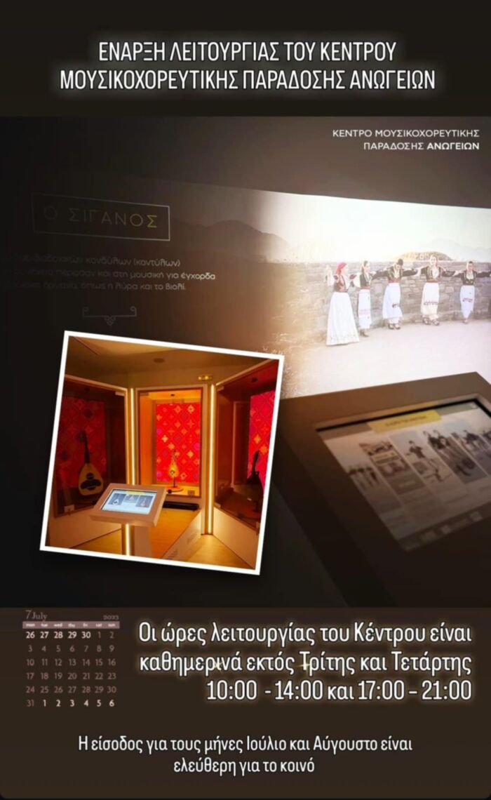 Ο Δήμος Ανωγείων και η ΚΟΙΝΣΕΠ Ν-ΙΔΑΙΑ Συνεργασία ανακοινώνουν την έναρξη λειτουργίας του Κέντρου Μουσικοχορευτικής Παράδοσης Ανωγείων. Τιμώντας την παράδοση του τόπου μας που η αρχή της χάνεται στο βάθος των αιώνων, η ανάδειξη και η παρουσίασή της στο ευρύ κοινό, ελληνικό και ξένο, αποτελούσε και αποτελεί ιερή υποχρέωση για το Δήμο Ανωγείων.