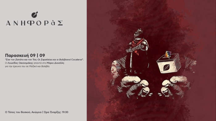 Μετά από την διακοπή του Αυγούστου, ο “Ανηφοράς” επανέρχεται! Αυτή την Παρασκευή, ο Λεωνίδας Οικονομάκης και ο Μάριος Διονέλλης θα συζητήσουν για τις εμπειρίες του πρώτου στην Λατινική Αμερική από τις οποίες προέκυψε το βιβλίο “Σαν τον Ζαπάτα και τον Τσε; Οι Zapatistas και οι Βολιβιανοί Cocaleros”.