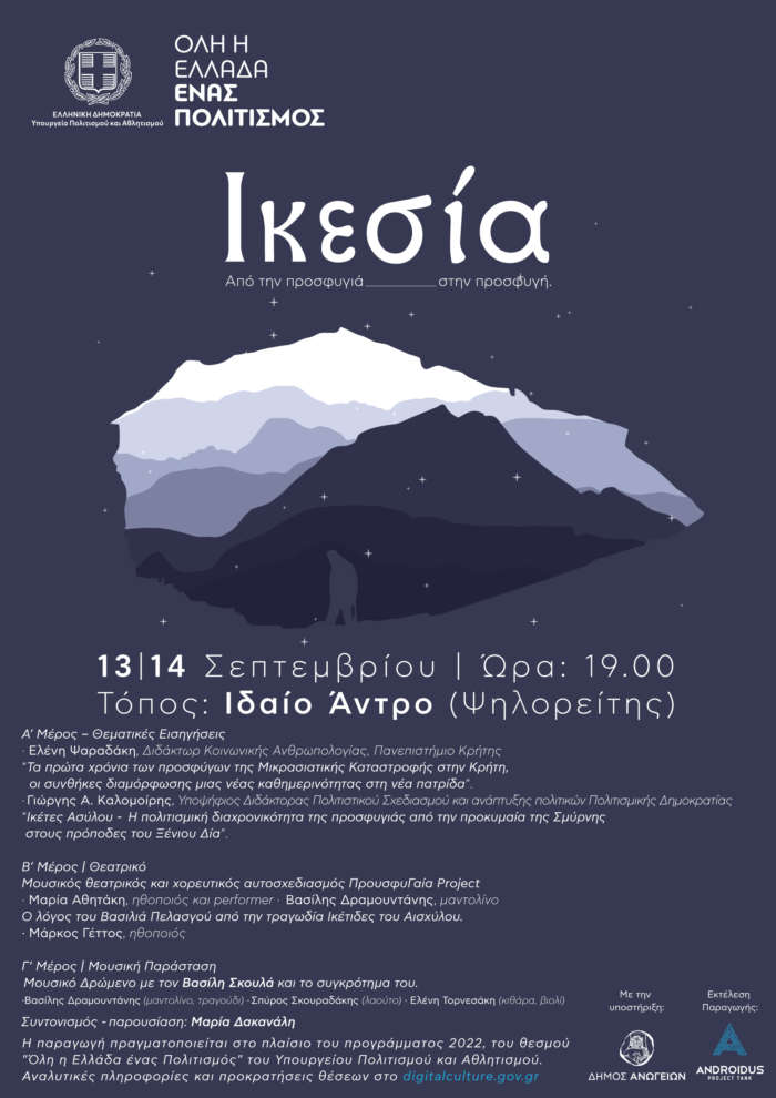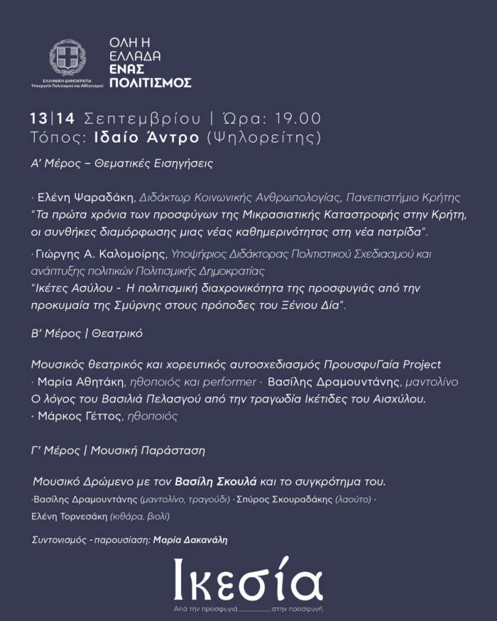 Σε αυτόν τον εμβληματικό χώρο, στην καρδιά του Ψηλορείτη, μέσα από μια καλλιτεχνική και επιστημονική σύμπραξη, προσεγγίζεται η διαχρονική έννοια της Ικεσίας ως προσφυγιάς και προσφυγής στο πλαίσιο συμπλήρωσης 100 χρόνων από την Μικρασιατική Καταστροφή.