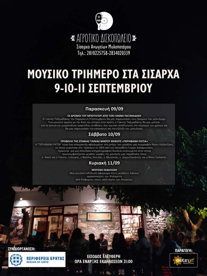 Ο Γιάννης Παξιμαδάκης την Παρασκευή 9 Σεπτεμβρίου θα μας παρουσιάσει τους δρόμους του μπουλγαρί. Ένα μουσικό όργανο με την δική του ιστορία στην Κρήτη, ο Γιάννης Παξιμαδάκης θα μας μιλήσει για τα αστικά και μικρασιάτικα τραγούδια, συνθέσεις που έμειναν αναλλοίωτες στο πέρασμα των χρόνων και θα μας παρουσιάσει την κατασκευή και την εξέλιξη του μπουλγαρί. Μαζί του θα είναι ο Γιάννης Ζαϊμάκης Καθηγητής Κοινωνιολογίας στο Πανεπιστήμιο Κρήτης και διευθυντής του Εργαστηρίου Κοινωνικής Ανάλυσης και Εφαρμοσμένης Κοινωνικής Έρευνας.