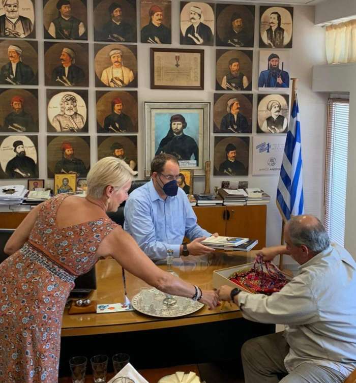 Πριν φύγει, βρέθηκε στο γραφείο του δημάρχου Ανωγείων Σωκράτη Κεφαλογιάννη ο οποίος του παρέδωσε ως δώρο και ενθύμιο της επίσκεψης μια πλουμιστή βούργια που τον εντυπωσίασε, ενώ ενθουσιασμένη ήταν και η Νατάσα Παζαίτη με το δικό της δώρο, μια εξαιρετικής ποιότητας υφαντή τσάντα. Ακόμα στον τέως πρωθυπουργό παραδόθηκαν δυο εκδόσεις, το “Ιδαίον Άντρον” των Γιάννη και Έφης Σακελλαράκη όπως και το βιβλίο “Ζώμινθος” της Έφης Σαπουνά-Σακελλαράκη, με τον πρώην πρωθυπουργό να μιλάει για την επίσκεψη που είχε πραγματοποιήσει λίγες ώρες πριν στο Κέντρο Αρχαιολογικής Πληροφόρησης αναφέροντας τη σημαντική δουλειά που γίνεται στα Ανώγεια στον τομέα των ανασκαφών και της προσπάθειας ανάδειξης του πλούτου της μακραίωνης ιστορίας του τόπου. Ο Κώστας Καραμανλής έγραψε μάλιστα και στο βιβλίο στην είσοδο του μουσείου για τις άριστες εντυπώσεις που αποκόμισε από τον χώρο.