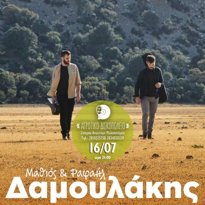 Ο Μαθιός & Ραφαήλ Δαμουλάκης θα μας επισκεφθούν το Σάββατο 16 Ιουλίου και ώρα 21:00 στο Αγροτικό δισκοπωλείο για να μας παρουσιάσουν τη νέα τους δισκογραφική δουλειά με τίτλο “Μη δυναμώνεις τη φωτιά”. Σας περιμένουμε !!