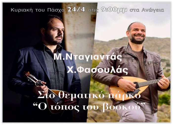 Με τον Μενέλαο Νταγιαντά στη λύρα και τον Χάρη Φασουλά στο μαντολίνο. Ώρα έναρξης στις 9 μ.μ. Στον όμορφο χώρο, στον “Τόπο του Βοσκού” στα Ανώγεια.