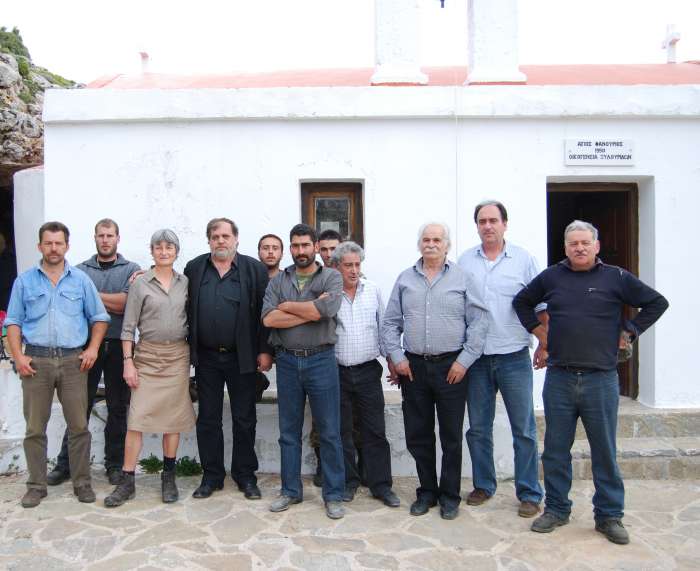 Πετροδολάκια Ψηλορείτη, Μάιος 2010. Η Γαβριέλα Μπούλοκ στον Άγιο Φανούριο της οικογένειας των Ξυλούρηδων. Δεξιά της Γαβριέλας ο Βασίλης Σπιθούρης, γιος του Μανόλη Σπιθούρη Νταμπακομανόλη που τραυματίστηκε βαριά στο σαμποτάζ της Δαμάστας στις 8 Αυγούστου 1944, πολεμώντας δίπλα στον Στάνλεϋ Μος. Τέταρτος από δεξιά, ο Γιαννάκος Ξυλούρης του Ανάστο. Ήταν ο κύριος συνομιλητής της Γαβριέλας κατά την επίσκεψή της στα Ανώγεια και την ανάβασή της στη Νίδα του Ψηλορείτη. Ο Γιαννάκος Ξυλούρης πέθανε στην Αθήνα την προηγούμενη Τετάρτη 13 Απριλίου και αφιερώνουμε με σεβασμό τη φωτογραφία και το άρθρο στη μνήμη του