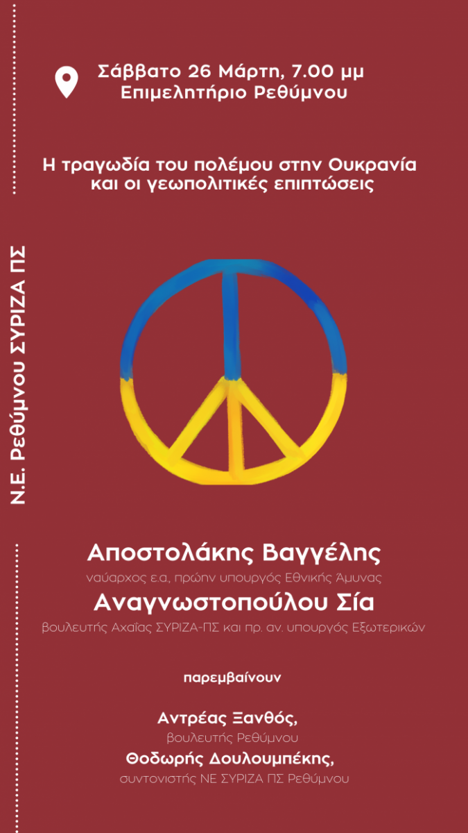 Ανοικτή πολιτική εκδήλωση-συζήτηση με θέμα «Η τραγωδία του πολέμου στην Ουκρανία και οι γεωπολιτικές επιπτώσεις», διοργανώνει η ΝΕ Ρεθύμνου του ΣΥΡΙΖΑ-ΠΣ το Σάββατο 26/3 στις 7 μμ στο Επιμελητήριο Ρεθύμνου.