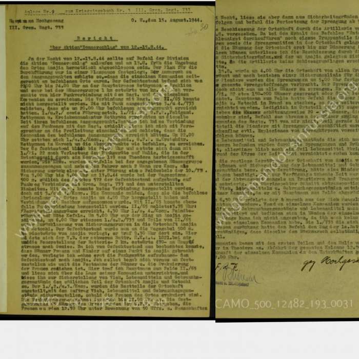 “Μετά την δημοσίευση στην Άνωγη του σχεδίου για την επιχείρηση “ΒΡΟΝΤΗ” και μια μικρή μου περιήγηση στον διαδικτυακό ιστότοπο wwii.germandocsinrussia.org εντόπισα τα επισυναπτόμενα έγγραφα όπου αποτελούν την Αναφορά του Λοχαγού Χόχγκεζανγκ του ΙΙΙ./ Σύνταγμα πεζικού 733, στις 15 Αυγούστου 1944, για την επιχείρηση “ΒΡΟΝΤΗ” της 12-15.8.44. Αυτός ο ιστότοπος περιέχει ψηφιοποιημένα αρχειακά έγγραφα που είναι επίσημα έγγραφα διαφορετικών χωρών και αποθηκεύονται σε διαφορετικά αρχεία της Ρωσικής Ομοσπονδίας. Παρουσιάζονται στον ιστότοπο αποκλειστικά για επιστημονικούς και ερευνητικούς σκοπούς. Οι επισκέπτες του ιστότοπου έχουν το δικαίωμα να εξοικειωθούν, να μελετήσουν και να χρησιμοποιήσουν έγγραφα μόνο για εκπαιδευτικούς ή επιστημονικούς σκοπούς. Με την αποδοχή αυτής της συμφωνίας, οι επισκέπτες του ιστότοπου αναλαμβάνουν την πλήρη ευθύνη για την παράνομη χρήση των υποβληθέντων εγγράφων σύμφωνα με την ισχύουσα νομοθεσία της Ρωσικής Ομοσπονδίας. Αποτελεί όπως αναφέρει ο ιστότοπος ΡΩΣΟ-ΓΕΡΜΑΝΙΚΟ ΣΧΕΔΙΟ ΓΙΑ ΤΗΝ ΨΗΦΙΟΠΟΙΗΣΗ ΓΕΡΜΑΝΙΚΩΝ ΕΓΓΡΑΦΩΝ ΣΤΑ ΑΡΧΕΙΑ ΤΗΣ ΡΩΣΙΚΗΣ ΟΜΟΣΠΟΝΔΙΑΣ. Αμέσως μετά το έστειλα Γιώργο Χριστόδουλου Σμπώκο, δικηγόρο ο οποίος και το μετάφρασε και όπως μου ανέφερε το μετέφρασε τιμής ένεκεν των κοινών μας προγόνων.”