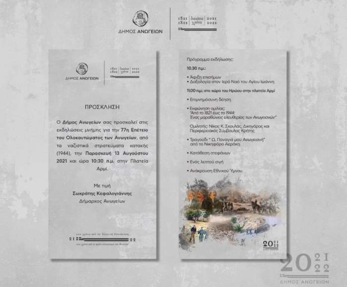 Ο Δήμος Ανωγείων, σας προσκαλεί στις εκδηλώσεις μνήμης για την 77η επέτειο του Ολοκαυτώματος των Ανωγείων, από τα ναζιστικά στρατεύματα κατοχής (1944), την Παρασκευή 13 Αυγούστου 2021 και ώρα 10.30 π.μ στην Πλατεία Αρμί.
