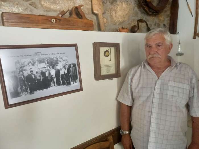 Ο Λυκούργος Πασπαράκης, γιος του μαχητή του ΕΛ.ΑΣ “Θοδωροπέτρου”, μπροστά στο ρολόι του “Σήφη” στο καφενείο “Πέτρινο”