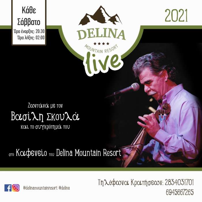 Κάθε Παρασκευή στην “Ντελίνα” θα υπάρχει μουσική βραδιά με την Ελένη Τορνεσάκη, Άγγελο Αρβανίτη και Μιχάλη Σκουλά. Το Σάββατο, ο Βασίλης Σκουλάς και το συγκρότημα του, αναλαμβάνουν την διασκέδαση σας στο καφενείο της “Ντελίνας”. Τις Κυριακές θα εμφανίζονται οι Νίκος Βλατάς, Βασίλης Δραμουντάνης και Βασίλης Ξυλούρης.