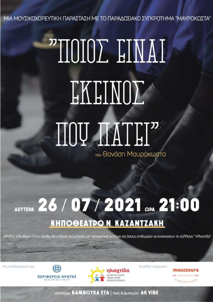 Ο Παγκρήτιος σύλλογος παιδιών με νεοπλασία “Ηλιαχτίδα” με τη συνδιοργάνωση της Περιφέρειας Κρήτης διοργανώνουν φιλανθρωπική μουσικοχορευτική παράσταση με το παραδοσιακό μουσικοχορευτικό συγκρότημα “Μαυρόκωστα” και το Θανάση Μαυρόκωστα με τίτλο «Ποιος είναι εκείνος που πατεί».