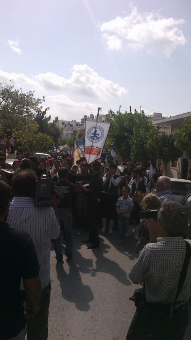 Μονιασμένη όλη η Κρήτη, εδώ στην πλατεία Αρμί, στην πλατεία των επαναστάσεων και των αγωνιστών στέλνει το μήνυμα ότι πορεύεται, κρατώντας στο ένα χέρι τη λύρα και στο άλλο όποτε χρειάζεται το τουφέκι, πορεύεται με οδηγό την εθνική αξιοπρέπεια, τη δημοκρατία και την κοινωνική δικαιοσύνη, στους αιώνες των αιώνων.