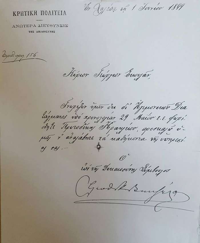 Στην φωτογραφία ο Ελευθέριος Βενιζέλος με τον Βασίλειο Σκουλά και ο διορισμούς του Γεωργίου Σκουλά ή “Τσιριντάνη” ως Πρωτοδίκη Ηρακλείου.