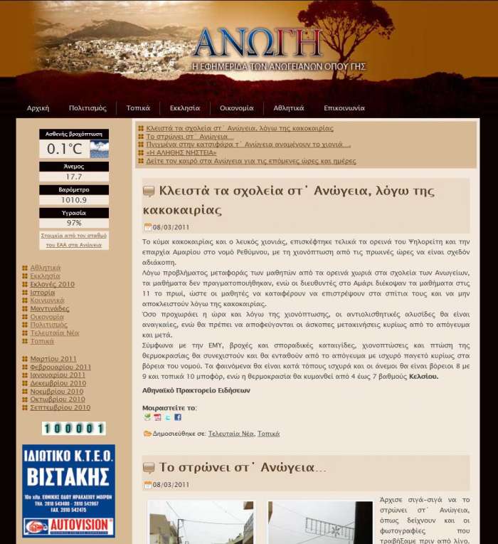 Η «ΑΝΩΓΗ» ξεπέρασε σήμερα τις 100.000 επισκέψεις. Η υψηλή επισκεψιμότητα της ιστοσελίδας μας γεμίζει ικανοποίηση αλλά και περισσότερες ευθύνες. Δίνουμε τη διαβεβαίωση σε όλους ότι θα συνεχίσουμε να καλύπτουμε κατά τον καλύτερο δυνατό τρόπο τα θέματα που αφορούν τα Ανώγεια και την γύρω περιοχή. Στόχος μας είναι το επόμενο διάστημα να βελτιώσουμε τις προσφερόμενες υπηρεσίες μας προς τους αναγνώστες μας. Είμαστε εδώ για να στηρίξουμε τ’ Ανώγεια, συμβάλλοντας στην προσπάθεια για την αντιμετώπιση των προβλημάτων, μέσα από την καταγραφή, την ανάδειξη και την κατάθεση προτάσεων.
