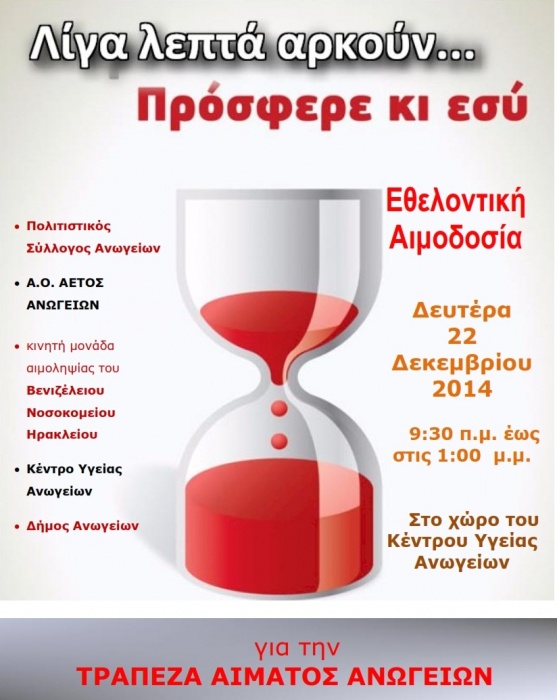 Εθελοντική αιμοδοσία διοργανώνει ο Πολιτιστικός σύλλογος Ανωγείων την ερχόμενη Δευτέρα 22 Δεκεμβρίου έξω από τον χώρο του Κέντρου Υγείας από τις 9.30 π.μ μέχρι και τη μια το μεσημέρι.