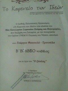 Ένας 78χρονος Ανωγειανός Κτηνοτρόφος ο Γιώργης Φασουλάς, γνωστός σε όλους μας ως Τροτσέλης μας εξέπληξε ευχάριστα στο άκουσμα της είδησης ότι κέρδισε τον περασμένο Νοέμβριο το δεύτερο βραβείο στην κατηγορία Νουβέλα στον 30ο Διαγωνισμό ”Σικελιανά 2014” που γίνεται από τον σύλλογο το ”Καφενείο των Ιδεών” στην Σαλαμίνα με την συνεργασία της UNESCO. Πρόκειται για ένα διεθνή πολιτιστικό μη κερδοσκοπικό Οργανισμό για την Ανάπτυξη του πνεύματος και της τέχνης.