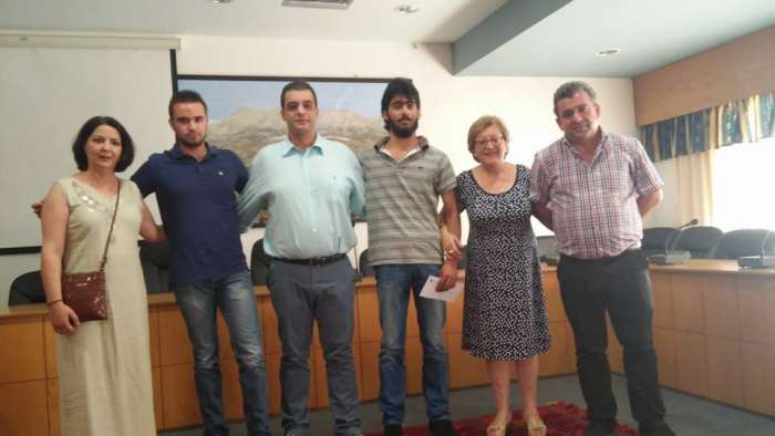 Από αριστερά: η πρόεδρος της Επιτροπής Παιδείας του Δήμου Μαίρη Μπαγκέρη, ο μαθητής Γιάννης Σαλούστρος,ο Βασίλης Δακανάλης, ο μαθητής Γιώργος Μακρυπόδης , η Δέσποινα Πρίμπου και ο Δήμαρχος Μανόλης Καλλέργης.
