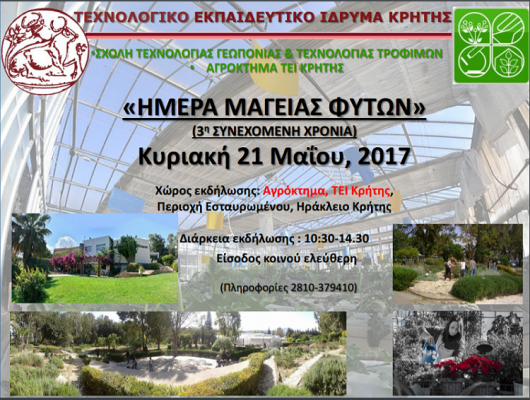 Για 3η συνεχόμενη χρονιά η Γεωπονική Σχολή του ΤΕΙ Κρήτης δια του Τμήματος Γεωπόνων και η Διεύθυνση Αγροκτήματος του ΤΕΙ Κρήτης, όπως κάθε Μάϊο, διοργανώνουν την Κυριακή 21/05/2017 από 10.30 έως 14.30, εκδήλωση αφιερωμένη στον κόσμο των φυτών με τίτλο:«Ημέρα Μαγείας των Φυτών»
