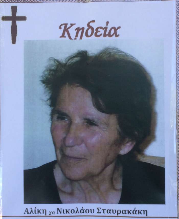 Πέθανε σήμερα Τρίτη η Αλίκη του Μεκιάνη χήρα Νικολάου Σταυρακάκη, (Επιστάτη) σε ηλικία 84 χρόνων. Η κηδεία της θα γίνει στα Άρμανώγεια αύριο 14/6/17 ημέρα Τετάρτη 12 το μεσημέρι.