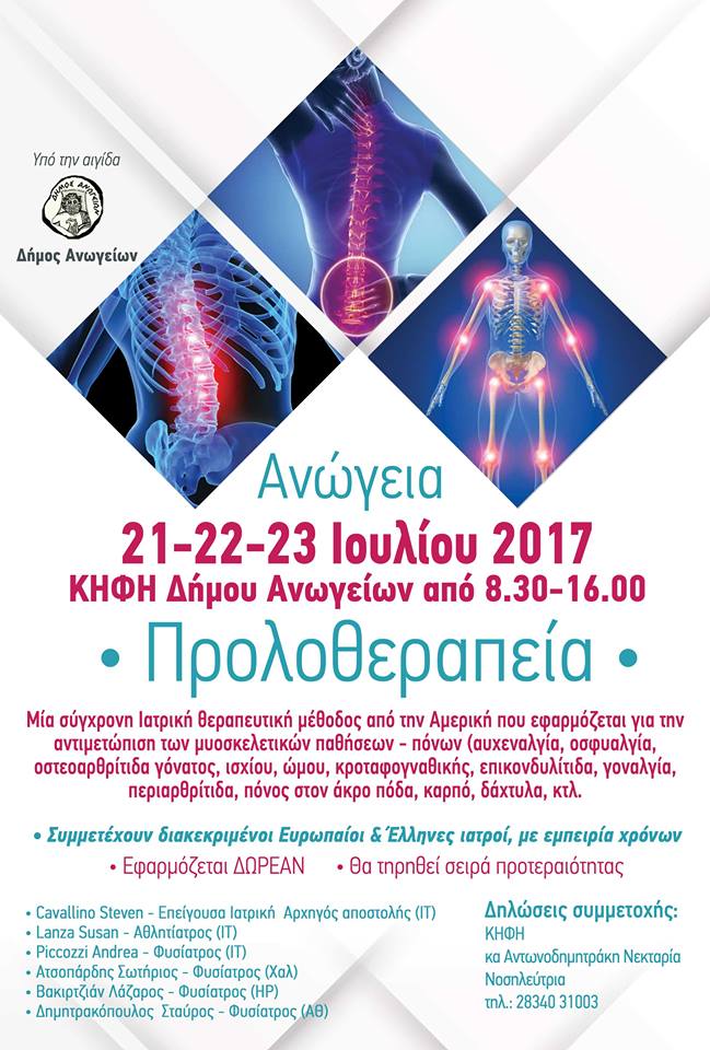 “Φέτος όπως και πέρυσι μία επίλεκτη ομάδα γιατρών (25 ατόμων) από όλο τον κόσμο, θα βρίσκεται στον τόπο σας, τα Ανώγεια, , για να προσφέρουν εντελώς δωρεάν θεραπείες Προλοθεραπείας σε όλους εσάς, αλλά και σε όποιον το έχει ανάγκη. Όλη αυτή η δραστηριότητα θα πραγματοποιηθεί με την αμέριστη υποστήριξη του Δήμου Ανωγείων.