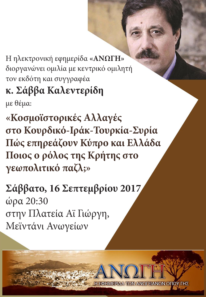 Το ερχόμενο Σάββατο στις 8.30 μ.μ θα πραγματοποιηθεί στην πλατεία Μεϊντάνι στα Ανώγεια, ομιλία, με κεντρικό ομιλητή τον εκδότη και συγγραφέα κ.Σάββα Καλεντερίδη, σε μια βραδιά που διοργανώνει η ηλεκτρονική μας εφημερίδα ΑΝΩΓΗ. Ο κ.Καλεντερίδης θα αναπτύξει σε μια ομιλία του σημαντικά θέματα για την διεθνή σκηνή και τον ρόλο της Ελλάδας και ειδικότερα της Κρήτης σε αυτήν. Αναλυτικά το θέμα της ομιλίας του έχει ως εξής:“Κοσμοϊστορικές αλλαγές στο Κουρδικό-Ιράκ-Τουρκία-Συρία. Πως επηρεάζουν Κύπρο και Ελλάδα. Ποιος ο ρόλος της Κρήτης στο γεωπολιτικό παζλ;”.