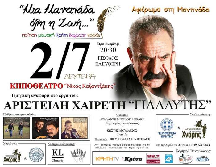 Σας προσκαλούμε στην εκδήλωση αφιέρωμα στην Κρητική Μαντινάδα που διοργανώνει ο Λαογραφικός όμιλος “Λάζαρος & Μανόλης Χνάρης” με τιμητική αναφορά στο έργο του μεγάλου μαντιναδολόγου Αριστείδης Χαιρέτης – Γιαλαύτης.