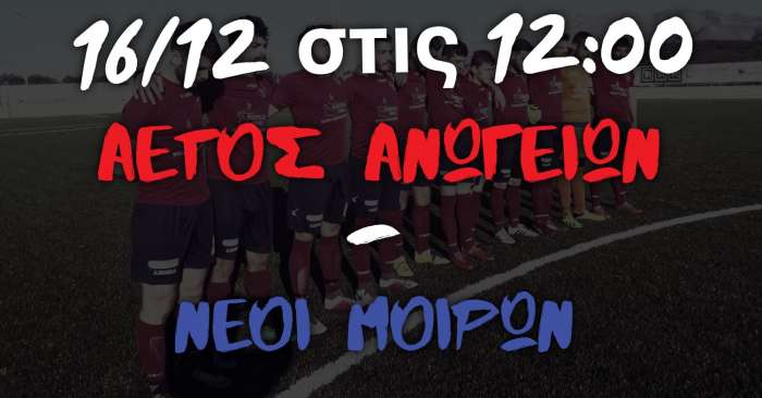 Την τελευταία “παράσταση” της χρονιάς δίνει ο Αετός αυτή την Κυριακή 16 Δεκεμβρίου, όπου θα υποδεχτεί στο Δημοτικό Στάδιο Ανωγείων, στις 12 μ.μ τους Νέους Μοιρών για την 10η αγωνιστική του πρωταθλήματος της Γ’ΕΠΣΗ. Αυτή θα είναι και η τελευταία αγωνιστική για την φετινή χρονιά, με την ομάδα μας να θέλει τη νίκη που θα την διατηρήσει στην κορυφή του βαθμολογικού πίνακα.