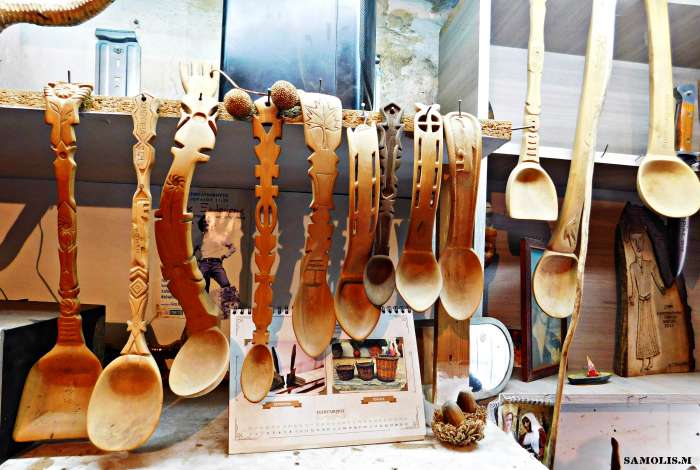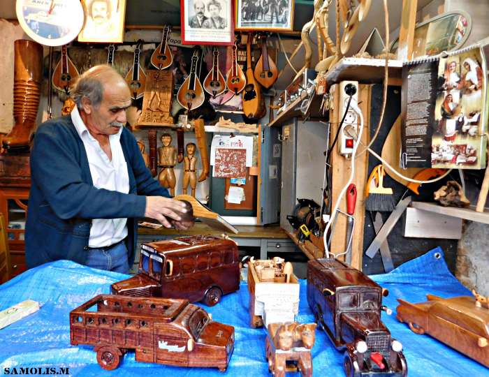 Όλη μέρα είμαι εδώ πέρα, χειμώνα καλοκαίρι. Θα σηκωθώ το πρωί, θα πάω στο καφενείο, θα γυρίσω εδώ πέρα περίπου τσι 8 η ώρα το πρωί και θα ξεκινήσω να δουλεύω στο ξύλο. Όλη μέρα μετά δουλεύω μέχρι τη βαθιά νύχτα. Αφού πολλές φορές ο γιος μου ο παπά Κώστας στεναχωριέται άμα έχει κάτι επείγον να κάνουμε παράδειγμα στσι ελιές αλλά με θωρεί ότι σκέφτομαι το εργαστήρι και μου λέει κάτσε. Αλλά με έχει συναρπάσει αυτή η δουλειά, όχι ότι βγάνω λεφτά αλλά μου αρέσει τόσο-να πολύ που δε μπορώ να το αφήσω. Νύχτα είναι, στο καφενείο κάθομαι; Εγώ σκέφτομαι το εργαστήρι μου.