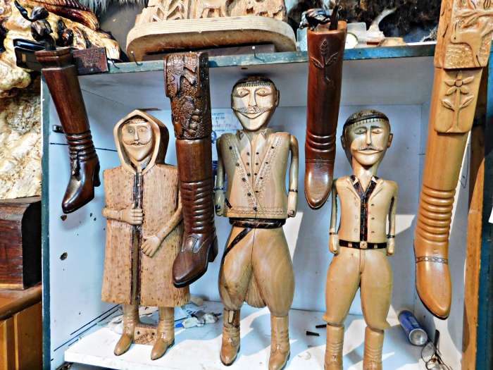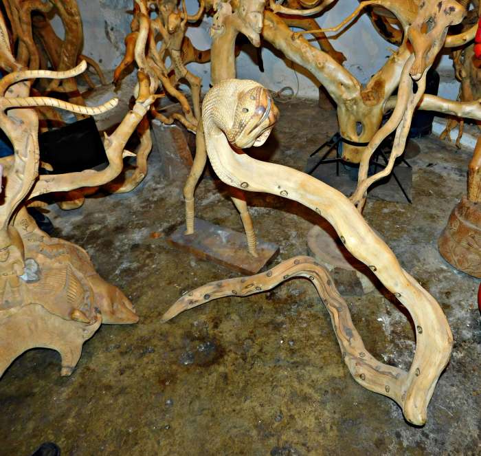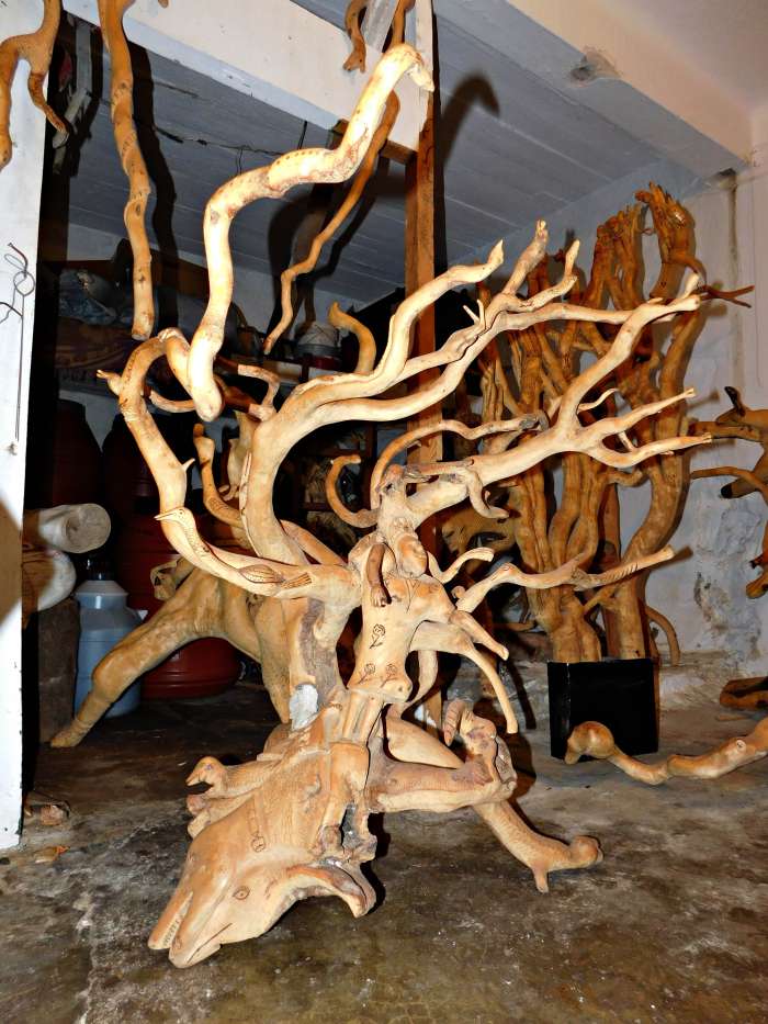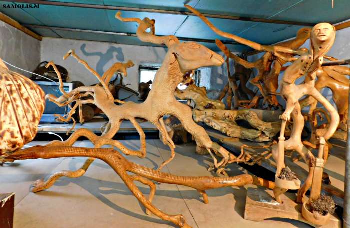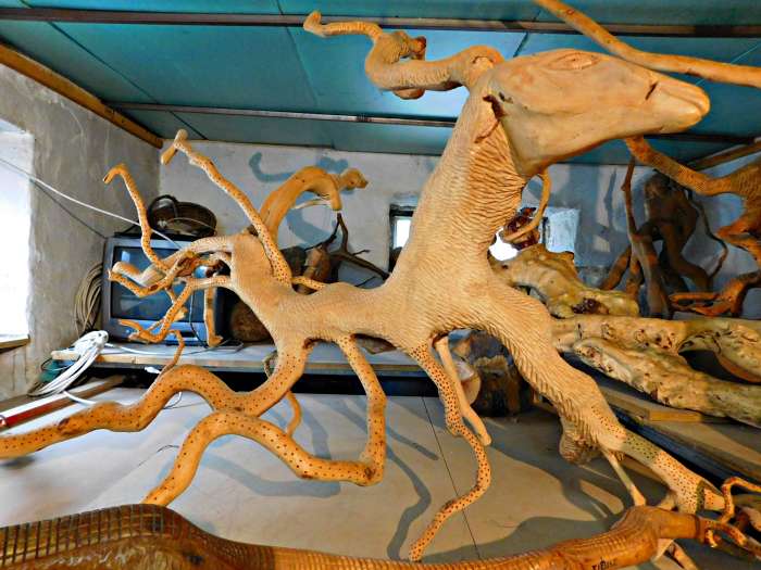 Εδώ έχω βλέπεις μια καμήλα και τον καμηλιέρη. Έχω κάνει επίτηδες τα παπούτσια του πολύ άσχημα για να δείχνει τη φτώχεια του, τη κακομοιριά του.Εδώ βλέπεις ένα άλλο ωραίο ξύλο. Από τη Ρουσαλίμνη. Είχα πάει να μεταφέρω τις αίγες του Γιαπεσογιάννη (σ.σ του Γιάννη Δακανάλη) στο Αρκάδι και είχα δει το ξύλο αυτό αποκάτω σε ένα ασφενταμάκι. Όταν επέστρεψα στη Ρουσαλίμνη επήγα ντελόγο να πάρω το ξύλο. Βλέπεις την ουρά ντου; Έχει πετάξει κλαδί και έχει κάτσει κάτω στο χωράφι και έχει κάμει ρίζες και έχει άλλο κλαδί και πάει απάνω. Αυτό το έβλεπες ότι είναι ένα έργο τσι φύσης! Ελάχιστες παρεμβάσεις του έκαμα εγώ, ένα 10% το άλλο 90% το είχε κάμει μοναχή της η φύση.