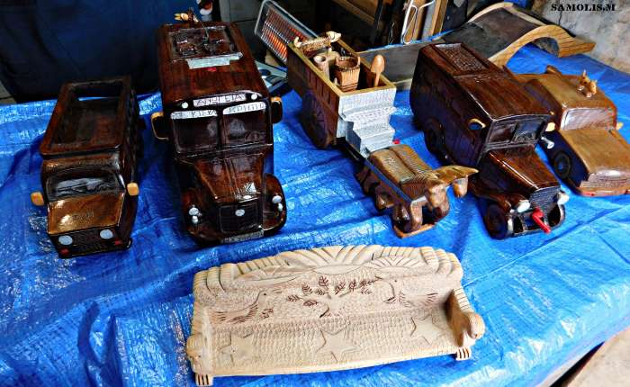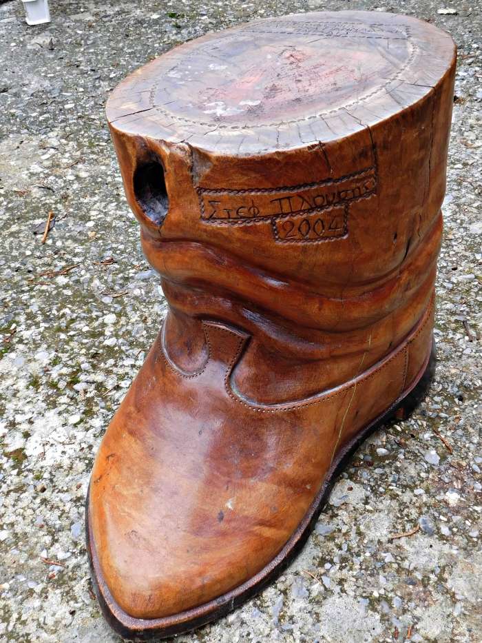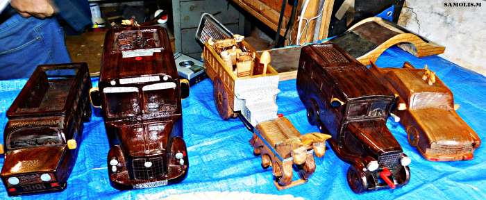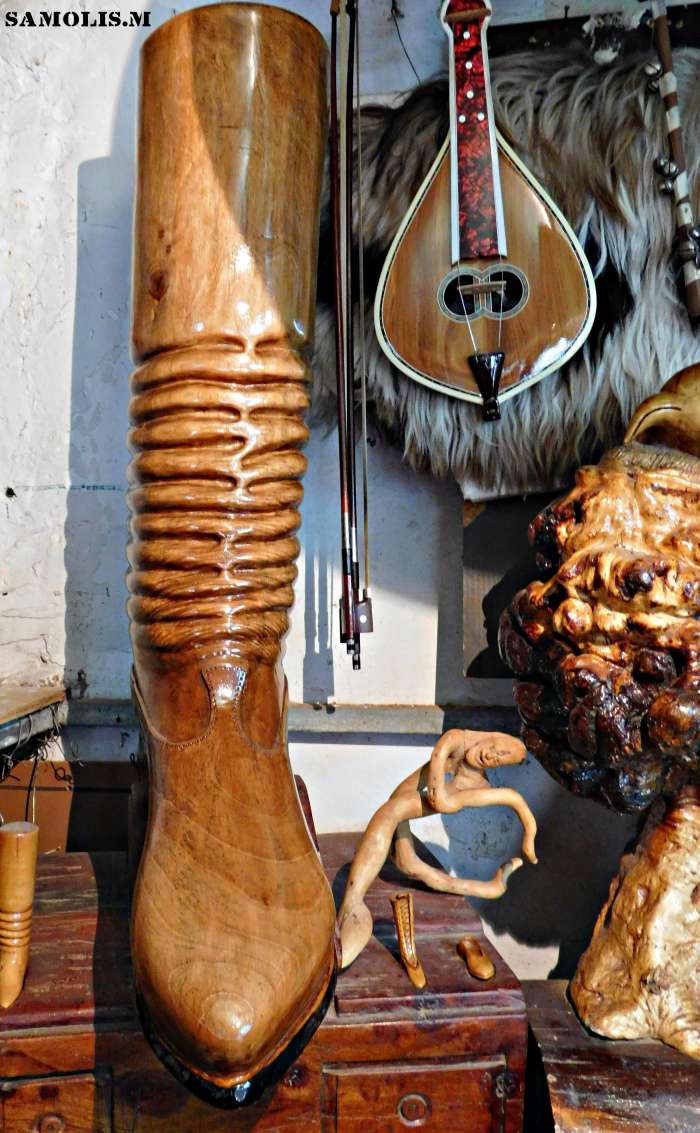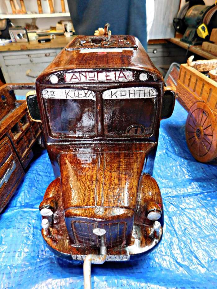 Κάνω ας πούμε αυτό το πράγμα εδώ, το αμάξι από ξύλο. Μετά δε μπορώ να κάμω δεύτερο. Μια κι όξω το κάνω δηλαδή! Δεν μπορώ να αντιγράψω κάτι και να το ξανακάμω το ίδιο. Έχω κάμει ας πούμε πολλά στιβάνια, τη γραμμή που έχει το καθένα δε μπορώ να την αντιγράψω και να την ξανακάμω την ίδια πάλι σε ένα άλλο. Δεν ξέρω να σου εξηγήσω το λόγο που γίνεται αυτό, αλλά γίνεται. Δεν μπορώ να κάμω δεύτερο ίδιο γλυπτό.