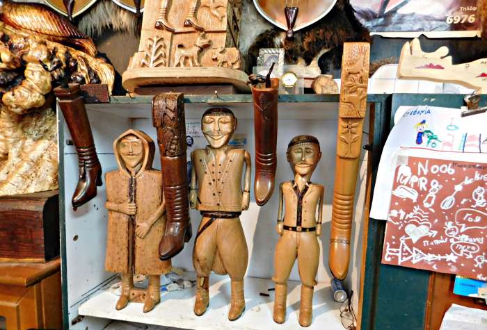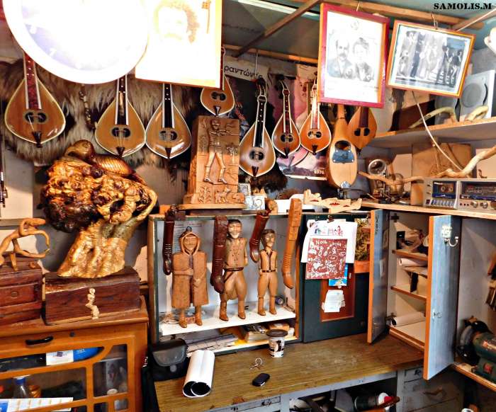 Να μην ξαναπιάσω ξύλο;Ε, πήγαινε με ντελόγο και στην Αγιά Παρασκευή(σ.σ εννοεί στο νεκροταφείο του χωριού) να με βάλεις μέσα. Δεν μπορώ να σταματήσω! Αφού και ο γιος μου ο παπάς όταν μου λέει να πάμε κάπου και μετά με βλέπει ότι έκατσα πάλι στο εργαστήρι μου λέει εντάξει κάτσε. Γιατί βλέπει πόσο με συναρπάζει όλο αυτό. Μου έφερε και τη σόμπα αυτή και δε με νοιάζει να έχει ένα μέτρο χιόνι όξω! Έχω και το κασετόφωνο και γροικώ τη μουσική μου, δε με βγάνεις εύκολα από παε μέσα! Εμένα Γιώργη αυτή είναι η ζωή μου. Όσο πιάνουν τα χέρια μου εγώ δε το σταματώ.Η όποια κούραση φεύγει μόνη της όταν τελειώσω ένα έργο. Πάω στο κρεβάτι μου μετά και λέω έκαμα κάτι.