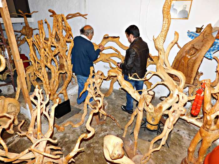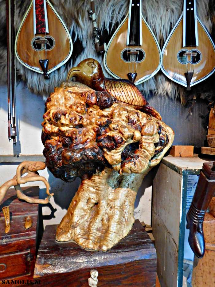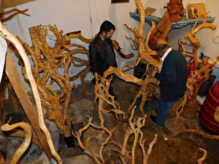 Πιο πολύ δουλεύω με ξύλο, έχω και μερικά με πέτρα μα δε μ’ αρέσει τόσο να δουλεύω πάνω στην πέτρα. Τα καλύτερα ξύλα για μένα σαν εργαλείο δικό μου είναι η μαύρη μουρνιά και η καρυδιά μάλλον θα έλεγα. Και η χαρουπιά είναι ωραία σαν γλυπτό, ο ασφένταμος, όλα αυτά είναι ωραία ξύλα. Το θέμα είναι να μην είναι χοντρό ξύλο, γιατί σκά!