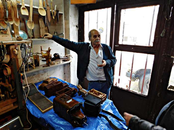 Εγώ έχω άγχος! Να φορτώσω το αμάξι να κάμω να δείξω και έλεγα θα με πιάσει έμφραγμα! Που θα πάω τα πράγματα, πως θα τα δώσω, ένα μόνιμο άγχος. Μερόνυχτα να λαλώ. Θυμούμαι με το γιο μου το Μπάμπη που είναι τώρα στο Ρέθυμνο, ήτανε Πάσχα και έκαμα 40 ώρες χωρίς να σταματήσω! Έπαιρνα τηλέφωνο δίνοντας τα πράγματα για να φορτώσω και από την Αθήνα. Εκεί λοιπόν υπήρχε ένα κενό. Να περιμένω ανθρώπους που είχανε δουλειά. Αυτές τις ώρες λοιπόν τις περνούσα στα αδέρφια μου που ήταν μαραγκοί. Εκεί ξεκίνησα να σκαλίζω για να περνά η ώρα μου μέχρι να ξαναφορτώσω! Θυμούμαι τα πρώτα πράματα που έφτιαξα ήταν ένα βαλιτσάκι και μετά μια λύρα! Πρέπει να το ντάκαρα όλο αυτό το 1978 περίπου! Και μου άρεσε πολύ, από την αρχή αυτή η ασχολία. Στην Αθήνα από τότε, την ώρα που θελά κάτσω για να περιμένω κάποιες ώρες μέχρι να πάω να φορτώσω, έκανα αυτή τη δουλειά! Έπρεπε να ήμουν εκεί στον αδερφό μου γιατί εκεί μόνο είχα τηλέφωνο να με πάρουνε δεν υπήρχανε κινητά τότε! Και όση ώρα επερίμενα λοιπόν εδούλευα το ξύλο με το χέρι στο μαραγκούδικο του αδερφού μου ή δούλευα στη κορδέλα. Για να περνά η ώρα μου μέχρι να χτυπήσει το τηλέφωνο!