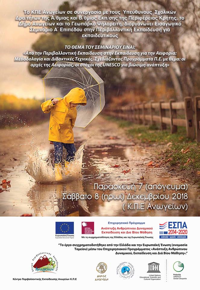 Το ΚΠΕ Ανωγείων σε συνεργασία με τους Υπεύθυνους Σχολικών Δραστηριοτήτων της Α/θμιας και Β/θμιας Εκπ/σης της Περιφέρειας Κρήτης, το Δήμο Ανωγείων και το Γεωπάρκο Ψηλορείτη, διοργανώνει Εισαγωγικό Σεμινάριο Α΄ Επιπέδου στην Περιβαλλοντική Εκπαίδευση την Παρασκευή 7 (απόγευμα) και Σάββατο 8 (πρωί) Δεκεμβρίου 2018 στα Ανώγεια, για εκπαιδευτικούς Α/θμιας και Β/θμιας Εκπ/σης. Το θέμα του σεμιναρίου είναι: