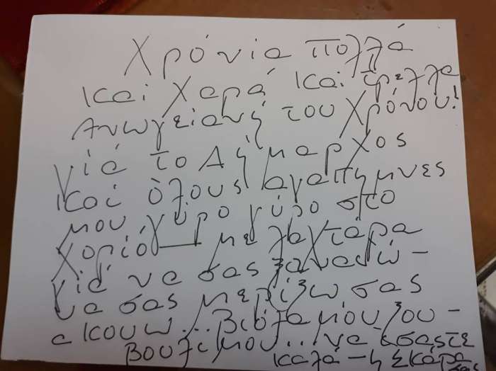 “Χρόνια Πολλά με χαρά και τρέλα Ανωγειανοί του χρόνου. Για το Δήμαρχο και όλους τους αγαπημένους μου γύρω-γύρω στο χωριό. Με λαχτάρα για να σας ξαναδώ, να σας μυρίζω, να σας ακούω..”Βιόλα μου, Ζουμπούλι μου. Να είσαστε καλά. Η Σκάρα σας..”