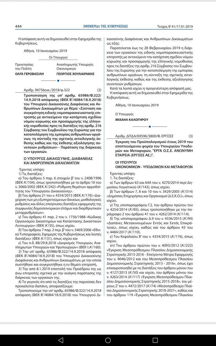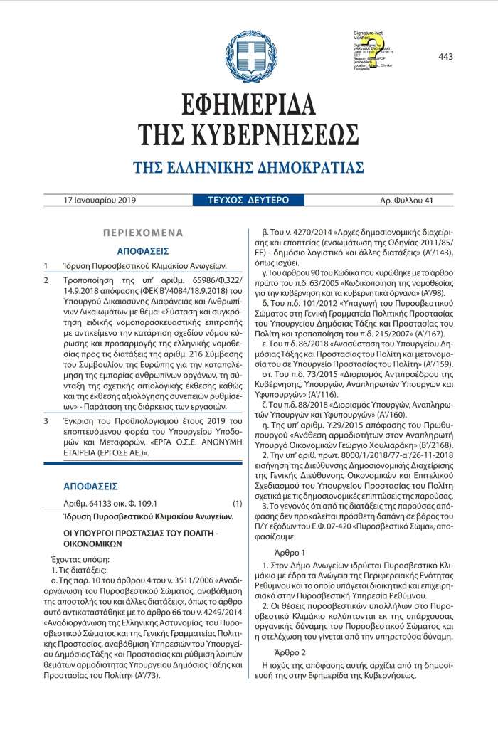 Ιστορική στιγμή για την Πολιτική Προστασία των Ανωγείων αποτελεί η υπογραφή στο Φύλλο Εφημερίδας της Κυβερνήσεως από την Υπουργό Προστασίας του Πολίτη Όλγα Γεροβασίλη και τον Αναπληρωτή Υπουργό Οικονομικών Γιώργο Χουλιαράκη για την δημιουργία Πυροσβεστικού κλιμακίου με έδρα τα Ανώγεια! Αποτελεί ουσιαστικά το επιστέγασμα της μεγάλης προσπάθειας της δημοτικής αρχής που το οραματίστηκε και πλέον παίρνει σάρκα και οστά με την υπογραφή στο ΦΕΚ με ημερομηνία την 17η Ιανουαρίου 2019, μετά από διαβουλεύσεις και εργασίες μηνών και μπροστάρη στις συναντήσεις και τις προεργασίες του Αντιδημάρχου Ανωγείων Βασίλη Σμπώκου.