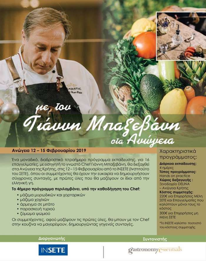 Ένα μοναδικό, διαδραστικό τετραήμερο πρόγραμμα εκπαίδευσης, για 16 επαγγελματίες, με εισηγητή το γνωστό Chef Γιάννη Μπαξεβάνη, θα διεξαχθεί στα Ανώγεια της Κρήτης, στις 12 – 15 Φεβρουαρίου από το ΙΝΣΕΤΕ (Ινστιτούτο του ΣΕΤΕ), όπου οι συμμετέχοντες θα έχουν την ευκαιρία να δημιουργήσουν σύγχρονες συνταγές, με πρώτες ύλες που θα μαζέψουν οι ίδιοι από την ελληνική γη.