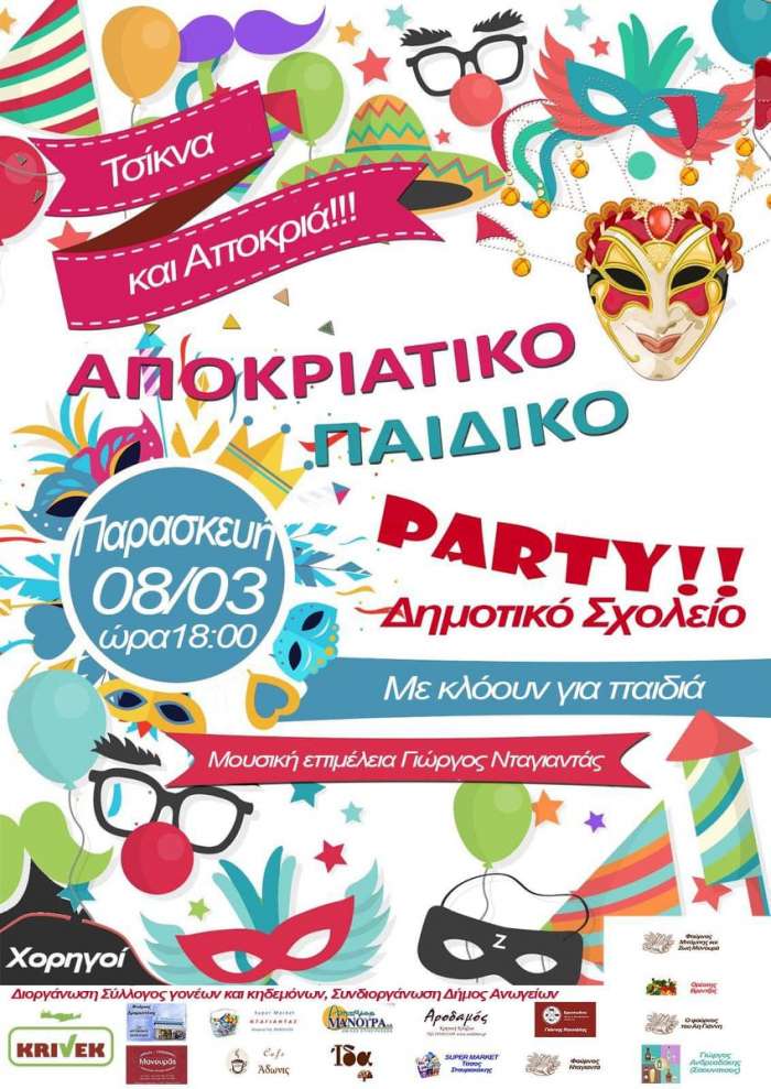 Τσίκνισμα και Αποκριάτικο πάρτι θα συνδυάσει η εκδήλωση του Συλλόγου Γονέων και κηδεμόνων του Δημοτικού, την Παρασκευή 8 Μαρτίου στις 6 μ.μ στον χώρο του σχολείου στα Ανώγεια. Μια όμορφη εκδήλωση για μασκαρεμένους μικρούς και μεγάλους, με την συμμετοχή κλόουν, τη μουσική επιμέλεια του Γιώργου Νταγιαντά, αλλά και εκατοντάδες σουβλάκια για το “τσίκνισμα” μια μεγάλη προσφορά της Ανωγειανής εταιρείας “KRIVEK”.Η εκδήλωση θα λάβει χώρα με τη συν-διοργάνωση και του Δήμου Ανωγείων. Καλή διασκέδαση και καλές αποκριές για όλο τον κόσμο..