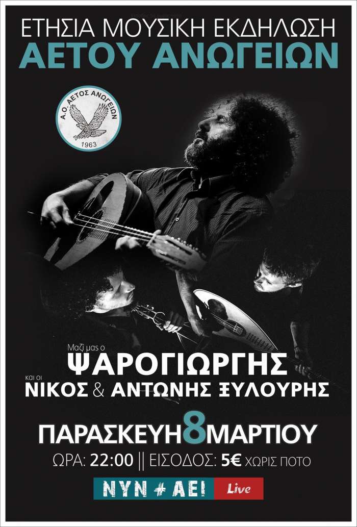 Η μεγάλη ετήσια χοροεσπερίδα του Αετού Ανωγείων θα πραγματοποιηθεί την ερχόμενη Παρασκευή 8 Μαρτίου στις 10 μ.μ στο Ηράκλειο και στο κέντρο “Νυν και Αεί”, μια μουσική βραδιά με στόχο την στήριξη της ομάδας μας. Ο Ψαρογιώργης και οι δυο γιοι του Νίκος και Αντώνης Ξυλούρης, υπόσχονται ένα αυθεντικό Ανωγειανό γλέντι στην “καρδιά” του Ηρακλείου! Η είσοδος θα είναι 5 ευρώ χωρίς ποτό.
