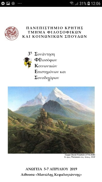 Το Πανεπιστήμιο Κρήτης και το τμήμα Φιλοσοφικών και κοινωνικών σπουδών, σε συνεργασία με τον Δήμο Ανωγείων πραγματοποιεί στα Ανώγεια την 3η συνάντηση φιλοσόφων, κοινωνικών επιστημόνων και συνοδοιπόρων, Το συνέδριο θα πραγματοποιηθεί την Παρασκευή 5 – Σάββατο 6 Απριλίου 2019 και Κυριακή 7 Απριλίου, στην Αίθουσα εκδηλώσεων της Τράπεζας Πειραιώς «Μανώλης Κεφαλογιάννης». Η συνάντηση θα περιλαμβάνει όπως κάθε χρόνο παρουσιάσεις και στρογγυλές τράπεζες από διδάσκοντες, καλεσμένους και μεταπτυχιακούς φοιτητές του Τμήματος.
