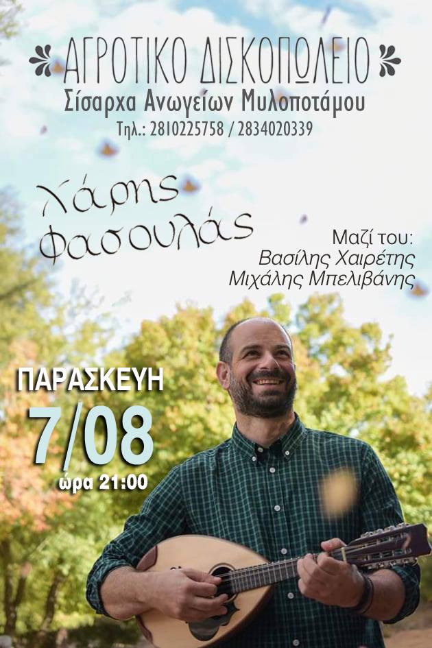 Παρασκευή 7 Αυγούστου στις 9 μ.μ ο Χάρης Φασουλάς με την παρέα του θα μας ταξιδέψει στους ήχους του μαντολίνου.