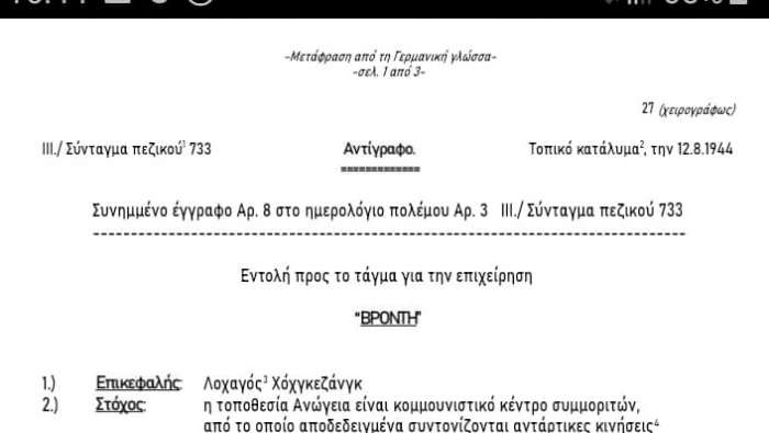 Το συγκλονιστικό ντοκουμέντο του εγγράφου της Επιχείρησης “Βροντή”, του γερμανικού σχεδίου, που περιγράφει σε τρεις σελίδες, όλη την επιχείρηση για το Ολοκαύτωμα των Ανωγείων στις 13 Αυγούστου 1944, θα φέρει ΓΙΑ ΠΡΩΤΗ ΦΟΡΑ στο φως της δημοσιότητας ( την ΤΕΤΑΡΤΗ 12 ΑΥΓΟΥΣΤΟΥ, παραμονή της επετείου) η ΑΝΩΓΗ σε συνεργασία με τον πρώην αντιδήμαρχο Ανωγείων Βασίλη Σμπώκο και τον συνταξιούχο πολιτικό μηχανικό και ιστορικό ερευνητή Βύρωνα Τεζαψίδη από τη Θεσσαλονίκη που ήταν αυτός που βρήκε τα έγγραφα και τα προσέφερε στους Ανωγειανούς.