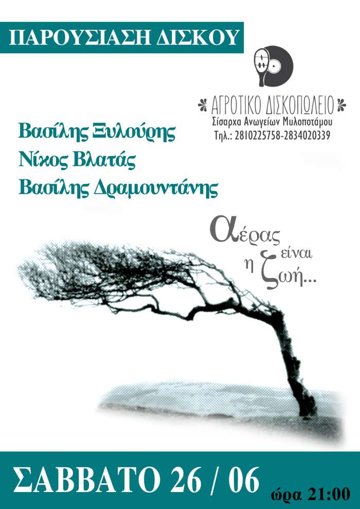 Ο Βασίλης Ξυλούρης και ο Νίκος Βλατάς , δεν είναι προγονόπληκτοι, ούτε μιμητές ενός άλλου καιρού. Μάστορες είναι, της μουσικής και του λόγου, άνθρωποι ευαίσθητοι, ραβδοσκόποι του σήμερα, που ξέρουν καλά να χειρίζονται τη βέργα της έρευνάς των, όταν αυτή συναντιέται με κοιτάσματα βαθιά στο χώμα απλωμένα. Η εργασία τους, «Αέρας είναι η ζωή» έχει τη ζωντανή δύναμη του παρόντα χρόνου, την ανανεωτική αύρα που «χρυσίζει» τη τέχνη και την κάνει σημερινή. Ο Βασίλης και ο Νίκος, επικυρώνουν μέσα μου την άποψη, ότι για να δεις το καινούργιο, πρέπει η σχέση σου με την παράδοση να είναι ισχυρή και προπαντός αθώα…”