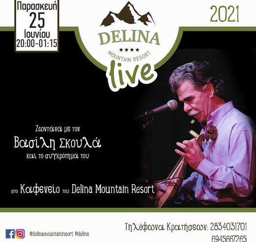 Επιστρέφουν στην “Ντελίνα” οι βραδιές με ζωντανή μουσική, στον εξωτερικό χώρο στο καφενείο, με μια εμφάνιση του Βασίλη Σκουλά, την ερχόμενη Παρασκευή 25 Ιουνίου στις 8 μ.μ, μέχρι και τις 1.15 π.μ. Ο δάσκαλος τη Κρητικής μουσικής, με το συγκρότημα του σας περιμένουν για μια αξέχαστη βραδιά. Για κρατήσεις :2834031701 & 6945667265