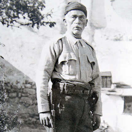 Ο Αρχηγός της Ανεξάρτητης Ομάδας Ανωγείων Α.Ο.Α. Χριστομιχάλης Ξυλούρης μετά τη δολοφονία του Γιάννη Δραμουντάνη-Στεφανογιάννη. Πήρε μέρος με άντρες της ομάδας του στο σαμποτάζ της Πυργούς Μαλεβυζίου, τη νύχτα της 23ης Ιουλίου 1944