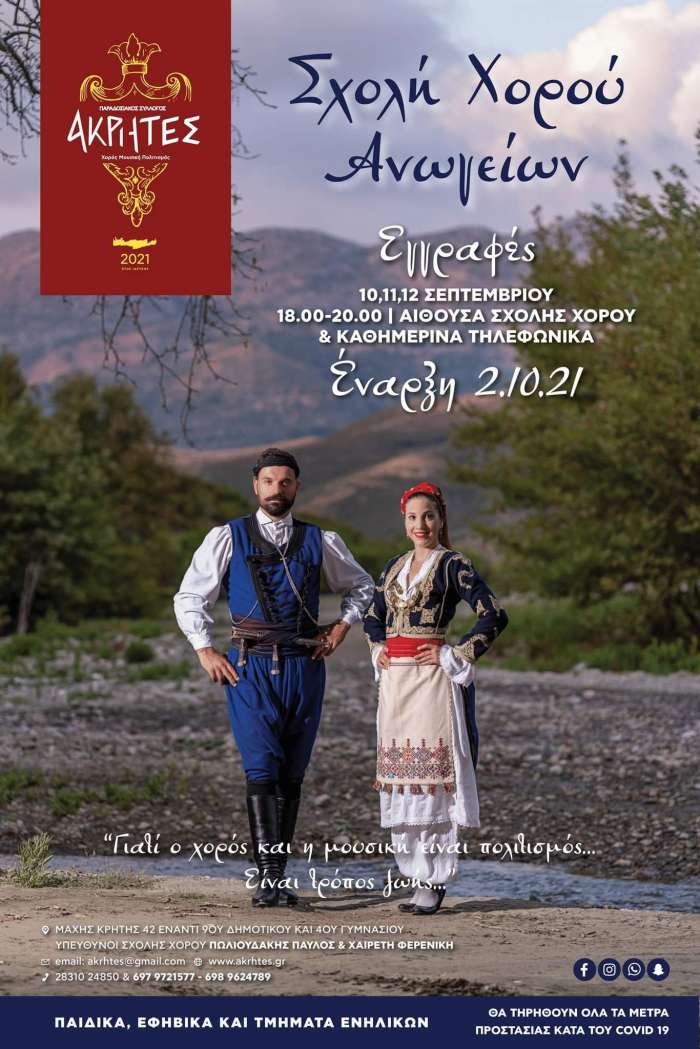 Ο Παραδοσιακός σύλλογος ΑΚΡΗΤΕΣ του Παύλου Πωλιουδάκη και της Φένιας Χαιρέτη ανακοινώνει την έναρξη των εγγραφών των μαθημάτων στη σχολή χορού Ανωγείων. Αναλυτικά: