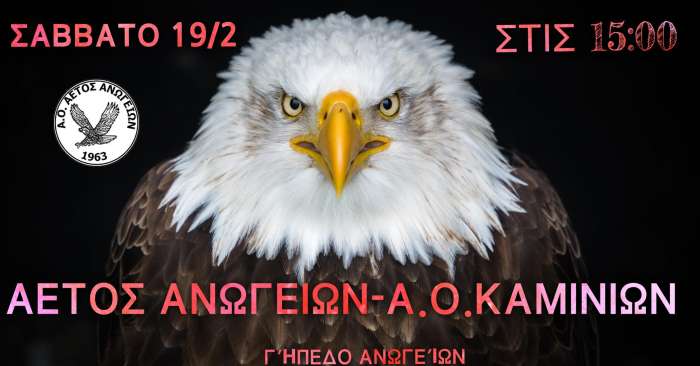 Για την 16η αγωνιστική του πρωταθλήματος, ο Αετός μετά από δυο συνεχόμενες νίκες, θα αντιμετωπίσει τα Καμίνια, το Σάββατο 19 Φεβρουαρίου στις 3 μ.μ στο Δημοτικό στάδιο, με στόχο το 3 στα 3 και τν βαθμολογική του αναρρίχηση. Η ομάδα μας θέλει να εκμεταλλευτεί στο έπακρον τα τρία συνεχόμενα παιχνίδια στα Ανώγεια, με Καμίνια, Αγία Βαρβάρα και Ασήμι, καθώς με τους εννιά αυτούς βαθμούς θα μπορεί να κοιτάξει ψηλότερα. Τα παιχνίδια θα είναι τρία καθώς ορίστηκε για την Τετάρτη 23 Φεβρουαρίου στις 4 μ.μ , ο αγώνας με την Αγία Βαρβάρα στα Ανώγεια, που είχε αναβληθεί λόγω του χιονιά.