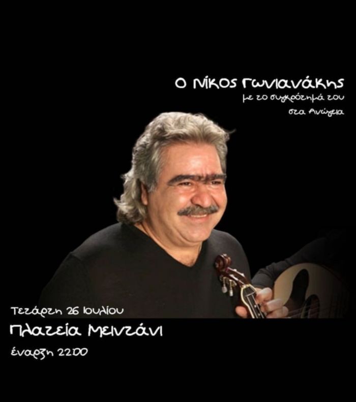 Οι βραδιές Μειντανιου συνεχίζονται την Τετάρτη 26 Ιουλίου με τον γνωστό καλλιτέχνη Νίκο Γωνιανάκη και το συγκρότημα του. σε ένα κρητικό γλέντι που θα ξεκινήσει στις 10 το βράδυ.