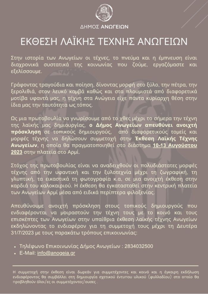 Στην ιστορία των Ανωγείων οι τέχνες, το πνεύμα και η έμπνευση είναι διαχρονικά συστατικά της κοινωνίας που ζούμε, εργαζόμαστε και εξελίσσουμε.